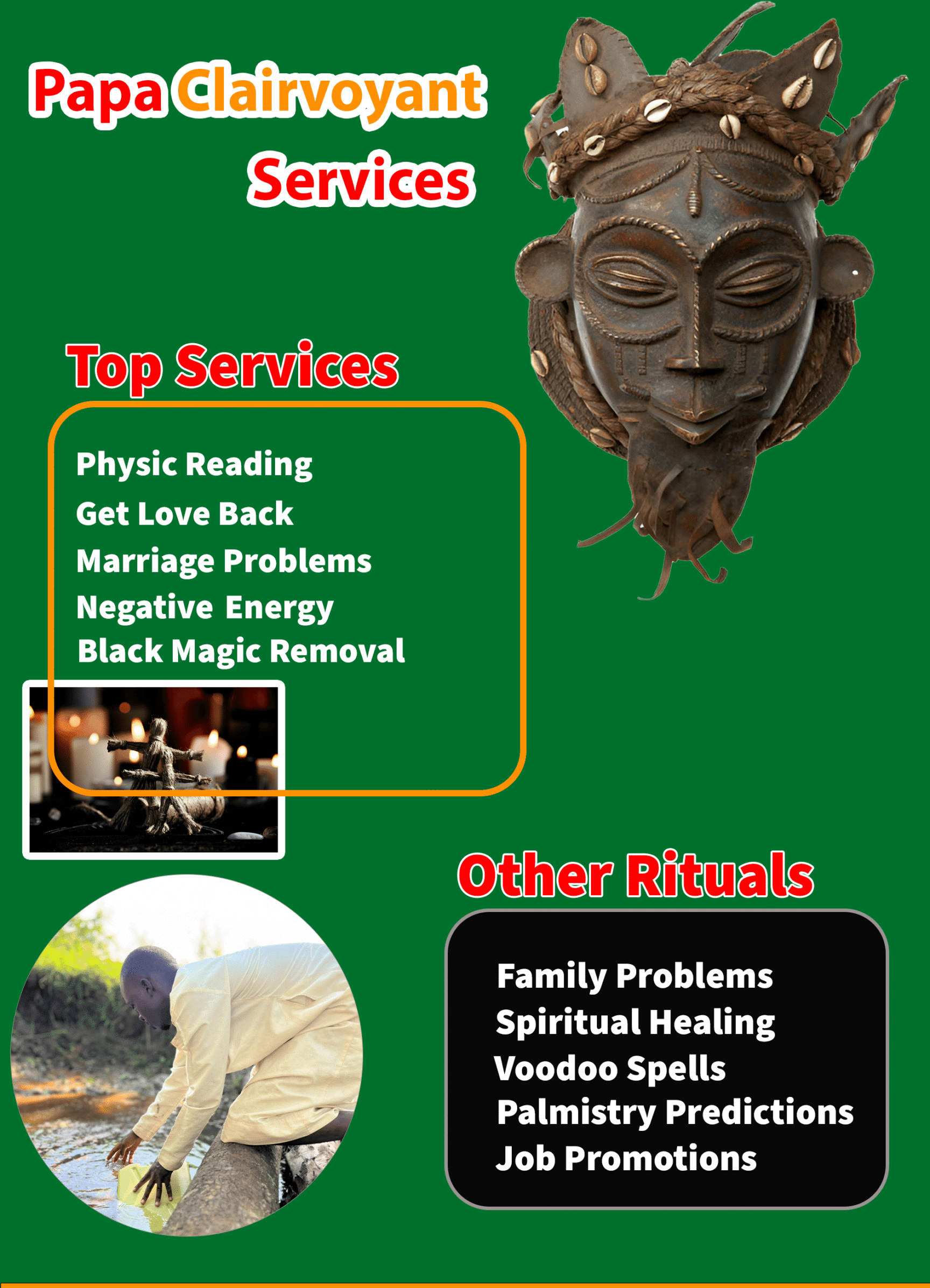 Experience the most trusted African rituals with Papa Clairvoyant Services. From love and financial rituals to psychic readings and spiritual cleansing, each service is carefully performed with deep ancestral power to bring real transformation in your life. Trusted in Kenya, USA, UK, and worldwide.
