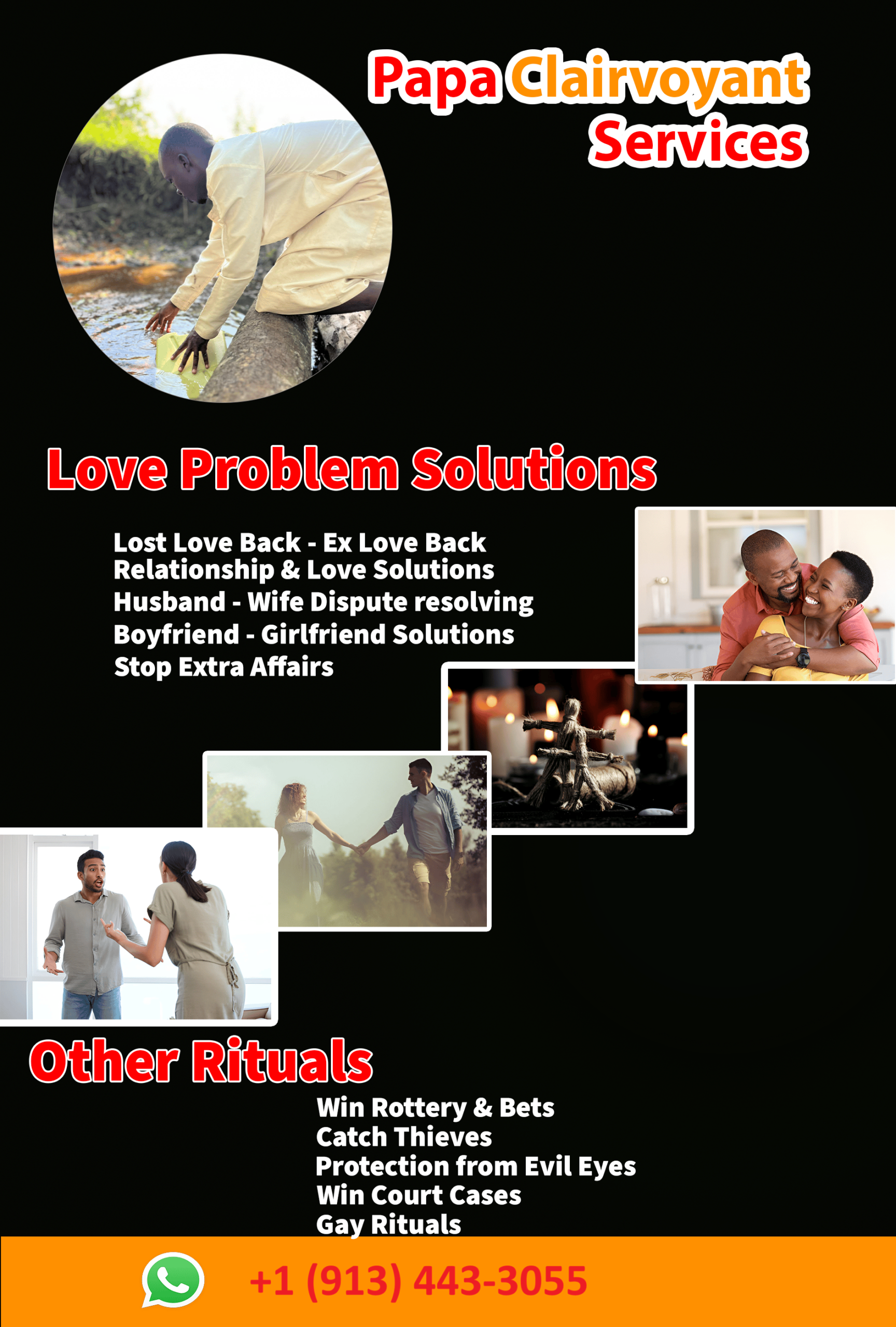 Are you facing challenges in your relationship, business, or personal life? Papa Clairvoyant Services is well-known traditional healer trusted by thousands across Uganda, USA, UK, Canada, Australia etc. With powerful African rituals and ancestral wisdom, i help bring back lost lovers, boost business luck, restore peace in marriages, and protect you from bad energy. Reach out today and experience real solutions- no fake promises, only results.When you introduce your problem I asses it and analyse it by conducting a full reading. I don’t start on a case without knowing that I will obtain results since I don’t want to raise your hopes in vain. I need you to feel comfortable before moving forward with my spells.I provide advice and take time to explain things I perform rituals during midnight and one needs to know that effective powerful spells are not a child’s play. Please be 18 + to order for my spells.